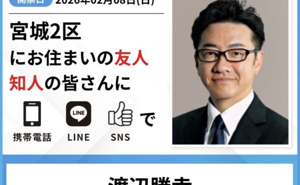 NEW 2026年2月6日PTA活動・おやじの会広報スタッフ 【最終日の告白】私が、交通の便の悪い「沖野」と、「仙台サンプラザ」を最後に選んだ本当の理由。渡辺勝幸です!明日、いよいよ選挙戦最終日です。 私の遊説スケジュールの「最後」を見て、不思議に思われた方もいるかもしれません。 なぜ、最後の一歩手前(15:30)に、決して交通の便が良いとは言えない「沖野」を選んだのか。 […]