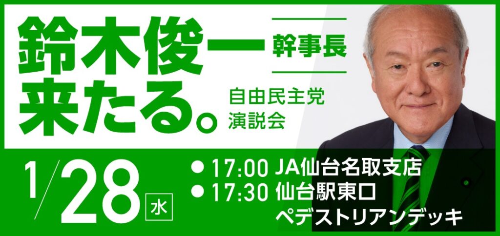 【緊急告知】自民党・鈴木俊一幹事長 来たる! 1月28日(水)、仙台駅東口ほかで街頭演説会を開催します。