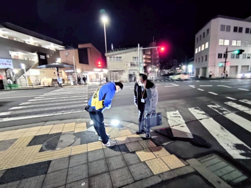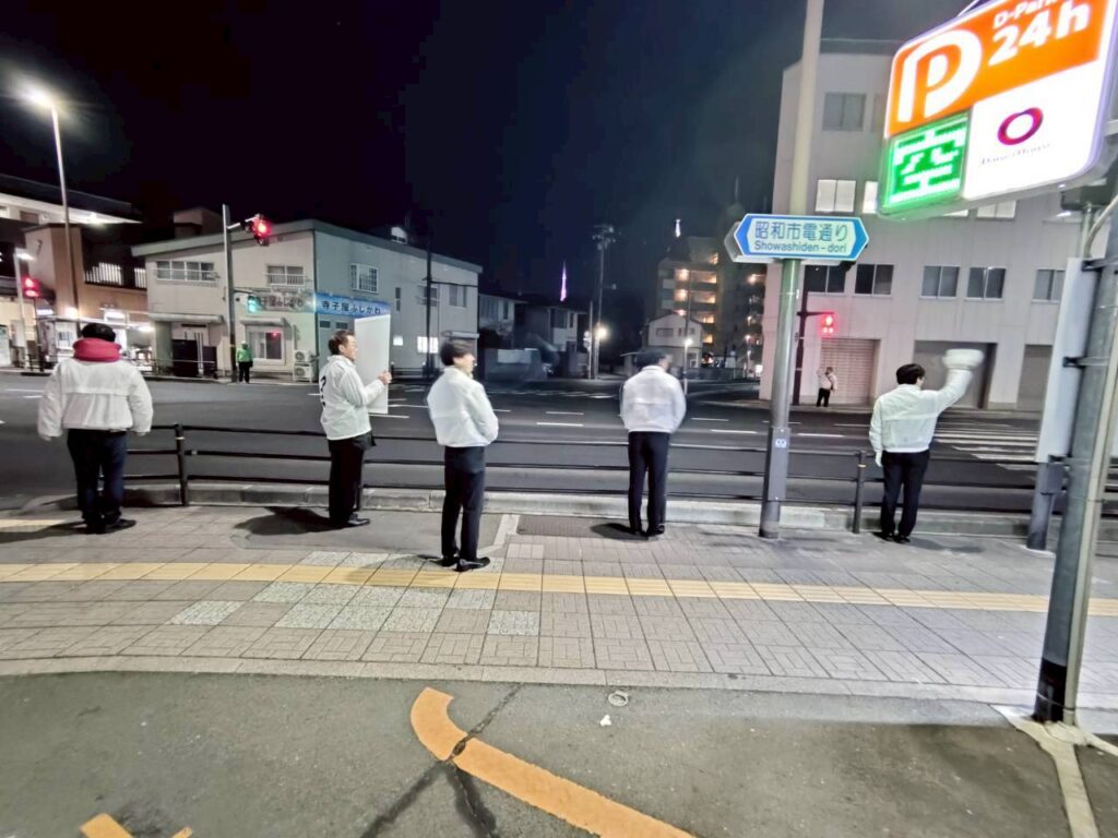 そう戸惑いながらも、彼らは自ら考え、交差点の四隅に散らばり、冷たい風の中に立ってくれました。 マイクで名前を連呼するわけではありません。 帰宅を急ぐ方々の邪魔にならないよう配慮しながら、ただ一言、「こんばんわ」「おかえりなさい」と頭を下げる。 胸が熱くなるのを抑えられませんでした。