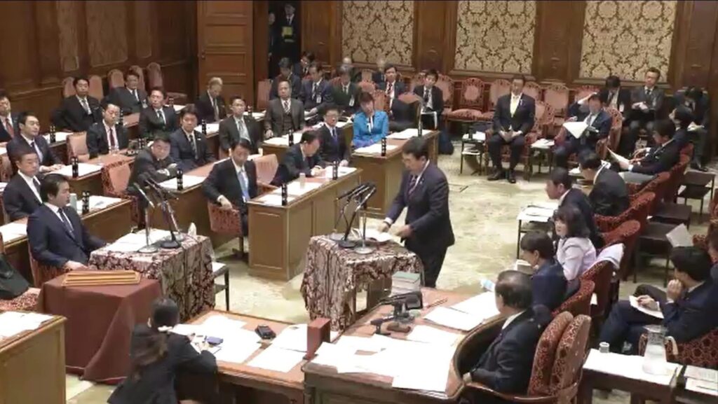 財金委員長報告の後、中道、国民、参政、みらいの討論、法案可決。
